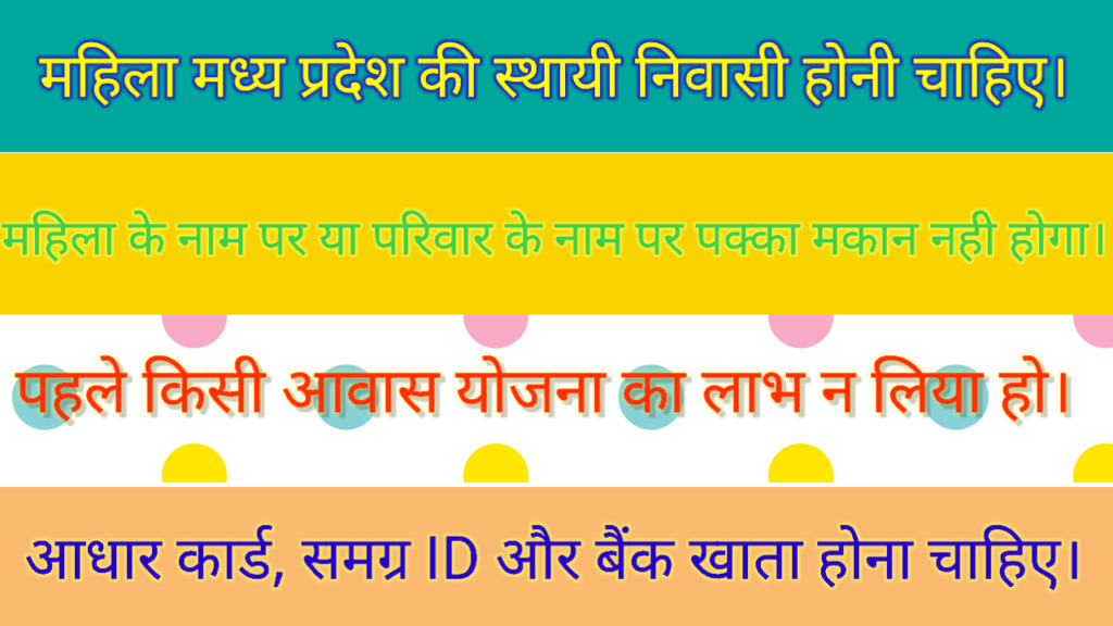 рд╕рдмрд╕реЗ рдЬрд░реВрд░реА рдмрд╛рдд рдпрд╣ рд╣реИ, рдХрд┐ рдЖрдк рдЕрдкрдиреА рдкрд╛рддреНрд░рддрд╛ рдХреЛ рд▓реЗрдХрд░ рдкреВрд░реЗ рдЕрдзрд┐рдХрд╛рд░ рдХреЗ рд╕рд╛рде рдЕрдкрдиреА рдмрд╛рдд рдЙрдирдХреЗ рд╕рд╛рдордиреЗ рд░рдЦреЗрдВред рд╕рд░рдХрд╛рд░ рдХрд╛ рдореБрдЦреНрдп рдордХрд╕рдж рд╣рд░ рдЬрд░реВрд░рддрдордВрдж рдмрд╣рди рдХреЛ рдЕрдкрдирд╛ рдШрд░ рджреЗрдирд╛ рд╣реИ, рдФрд░ рдпрдХреАрди рдорд╛рдирд┐рдП, рдЕрдЧрд░ рдЖрдк рдЗрд╕ рдпреЛрдЬрдирд╛ рдХреЗ рд▓рд┐рдП рд╡рд╛рдХрдИ рдкрд╛рддреНрд░ рд╣реИрдВ, рддреЛ рдЖрдкрдХрд╛ рд╣рдХ рдЖрдкрдХреЛ рд╣рд░ рд╣рд╛рд▓ рдореЗрдВ рдЬрд╝рд░реВрд░ рдорд┐рд▓реЗрдЧрд╛ред рдпрд╣ рд▓реЗрдЦ рдХреЗрд╡рд▓ рд╕рд╛рдорд╛рдиреНрдп рдЬрд╛рдирдХрд╛рд░реА рдХреЗ рдЙрджреНрджреЗрд╢реНрдп рд╕реЗ рд▓рд┐рдЦрд╛ рдЧрдпрд╛ рд╣реИред рдпреЛрдЬрдирд╛ рд╕реЗ рдЬреБрдбрд╝реА рдЕрдВрддрд┐рдо рдЬрд╛рдирдХрд╛рд░реА рдФрд░ рдирд┐рдпрдореЛрдВ рдХреЗ рд▓рд┐рдП рд╕рдВрдмрдВрдзрд┐рдд рд╕рд░рдХрд╛рд░реА рд╡реЗрдмрд╕рд╛рдЗрдЯ рдпрд╛ рдЕрдзрд┐рд╕реВрдЪрдирд╛ рдЕрд╡рд╢реНрдп рджреЗрдЦреЗрдВред